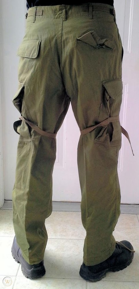Jungle fatigues, as they became known, had similar design characteristics. The coat consisted of two slant pockets on the chest and two lower bellows pockets. Each of these pockets closed with two buttons and a button front closure. The pants consisted of two hip pockets with single-button closure, two slash pockets at the hips and two bellows pockets on the thigh with dual button closure. The left thigh bellows pocket also had a "hidden" survival pocket located inside. The pants could be either button fly or zip.